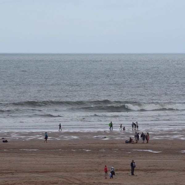 2-3ft surf with a moderate Southerly cross shore wind. A little southerly cross chop on the faces, but not too bad, peaky, with every now and again, some long walls, that're still holding up, through to the inside