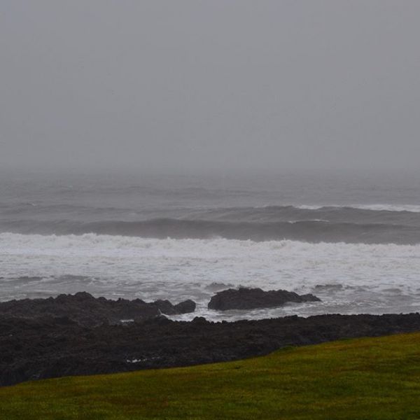 6-8ft+ surf with a light Northwesterly onshore wind. The winds dropped out in the last hour, some lumpy long drawn out peaks coming through, with reasonably clean faces. However, although the wind's dropped, it's still on the big side and a little disorganised due to the effects of this mornings stronger onshore wind.