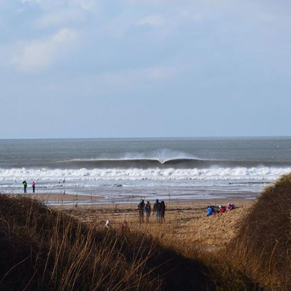 Solid 6ft+ surf on sets with a fairly strong ENE offshore wind around mid tide on the drop. Clean long wally lines entering the bay illuminated by a bit of winter sun. Strength of the wind could prove to be more of a problem when paddling into the waves as it approaches low tide later this afternoon
