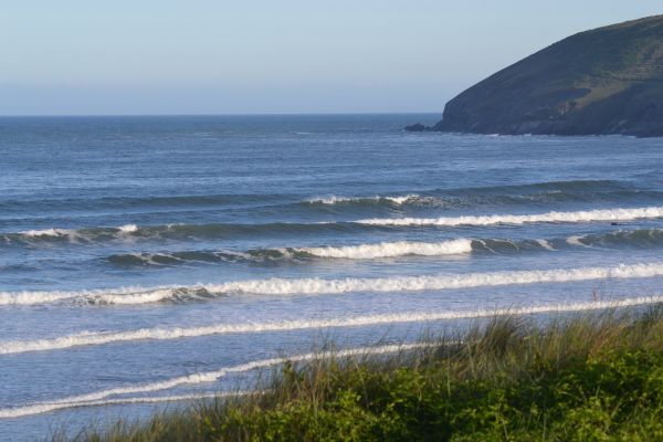 3ft surf with a light Northerly cross shore breeze, but quite sheltered in the bay. Still a little bit of shape, reasonably clean and very surfable as it pushes up towards high tide. It'll probably loose a little bit of size as the tide drops away and also let the wind in a little.